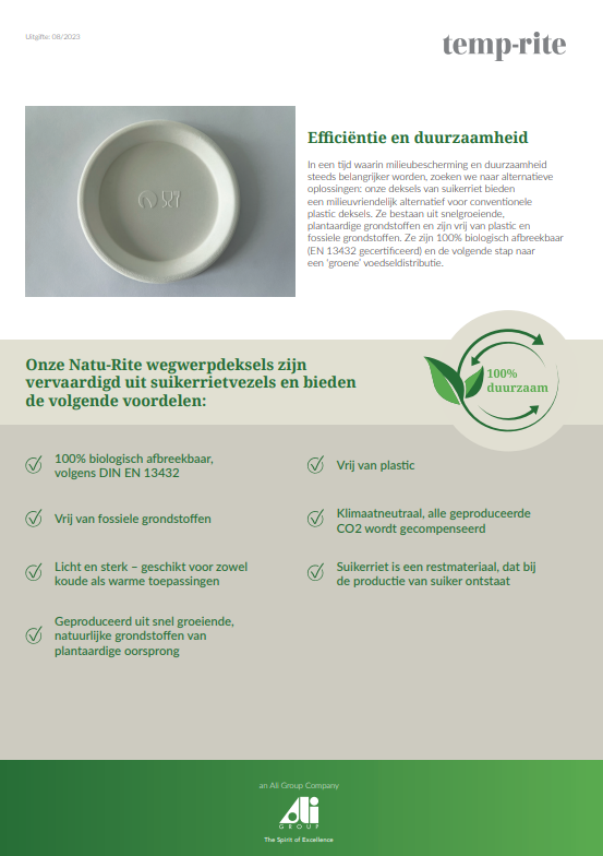 De Natu-Rite wegwerpdeksels zijn vervaardigd uit suikerrietvezels en bieden een milieuvriendelijk alternatief voor conventionele plastic deksels. Ze zijn 100% biologisch afbreekbaar volgens DIN EN 13432 en vrij van plastic en fossiele grondstoffen – de volgende stap naar een groene voedseldistributie.